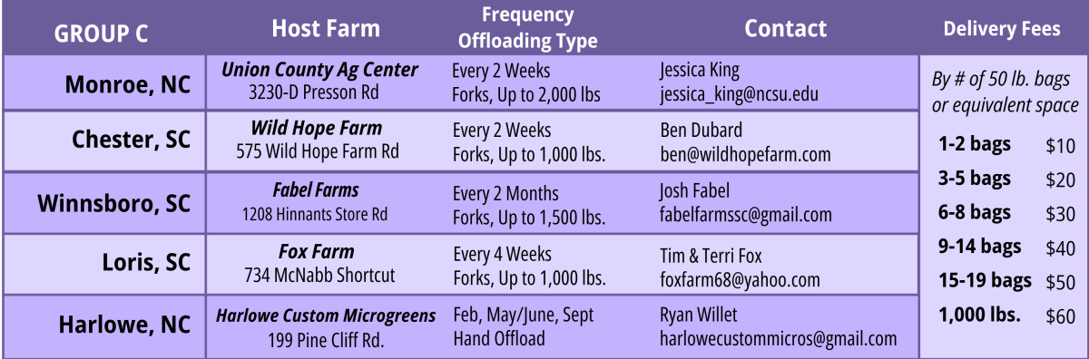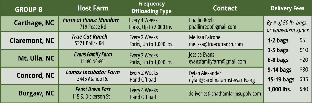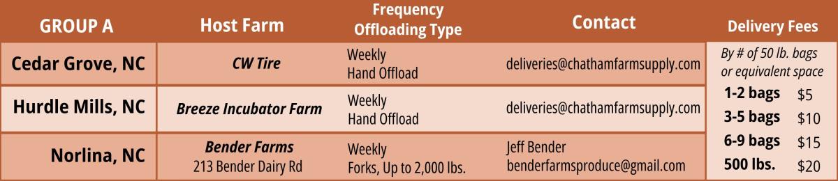 Have questions? Reach out to deliveries@chathamfarmsupply.com with questions and to get established on one of our delivery routes.